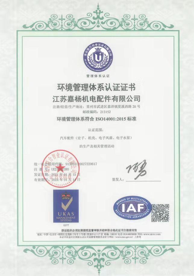 江苏嘉杨机电配件有限公司是专业研发生产各类汽车零部件的企业,也是国家高新技术企业,江苏省民营科技企业,工厂占地面积2.5万平方米,注册资金500万人民币,拥有员工170余人,其中研发及技术人员20余人,并在常州、上海分别设立研发中心,公司主要产品有:汽车起动电机零件、汽车冷却系统零部件,汽车电子零件。公司有三十多年汽车零部件制造业经验,公司已通过IATF16949,ISO14001认证,建立了完善的产品研发、生产、销售和售后服务体系。生产的产品均通过欧盟CE认证,并获得多项发明专利,我们一直坚持质量持续改善PDCA,现场5S管理以及精益化生产的理念,为客户提供最具有价值的产品与服务。